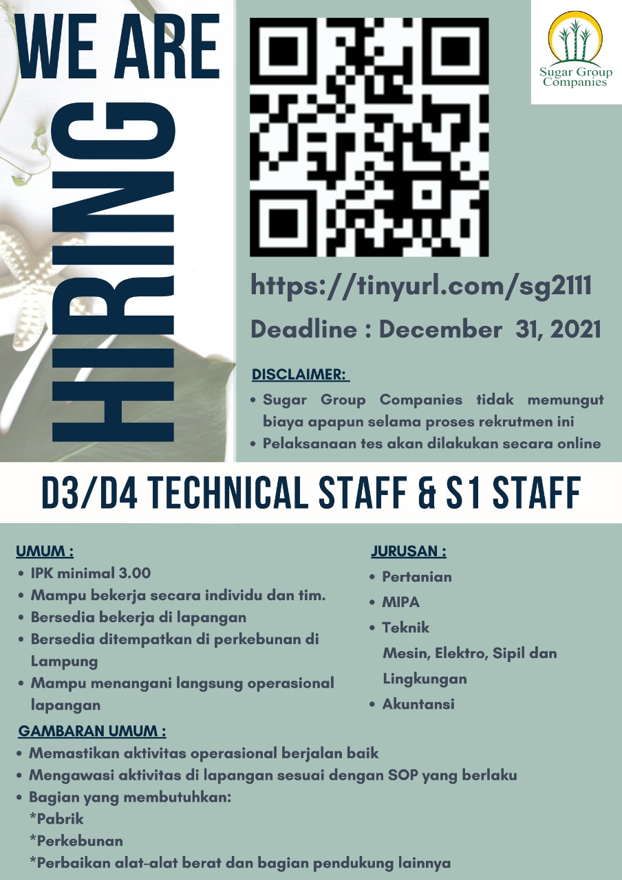 Sugar Group Companies adalah perkebunan dan pabrik Gula di Propinsi Lampung. Kami mengajak anda untuk bergabung dengan perusahaan kami. Informasi kebutuhan dan kualifikasi bisa diketahui lebih lanjut pada gambar di bawah ini, dan untuk pendaftaran silakan klik di sini " HIRING SUGAR GROUP COMPANY"