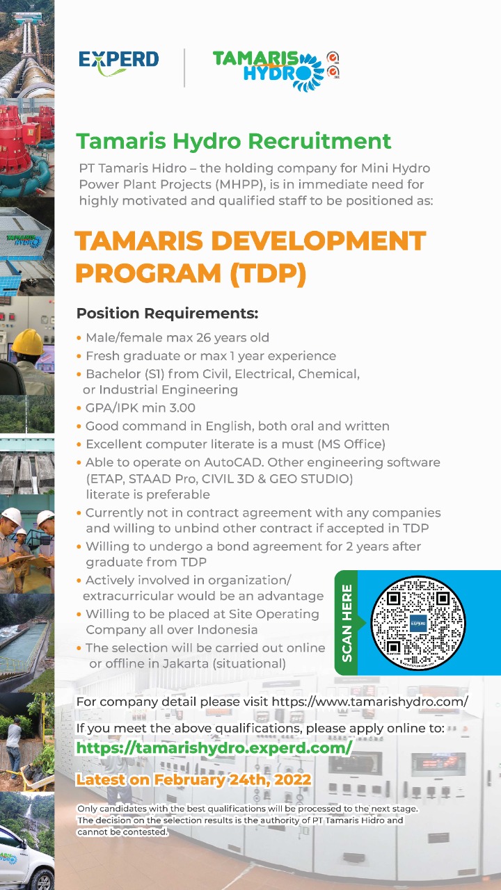 PT Tamaris Hidro – the holding company for Mini Hydro Power Plant Projects (MHPP), is in immediate need for highly motivated and qualified staff to be positioned as: