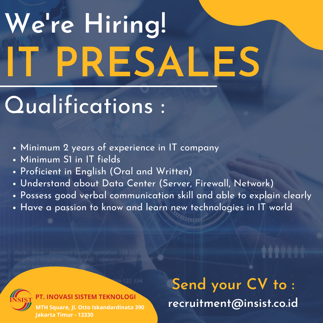 Inovasi Sistem Teknologi (Insist) adalah perusahaan Solusi Teknologi Digital khususnya dibidang Data Center & Keamanan Sistem Informasi. Dengan didukung oleh sumberdaya yang handal & berkualias serta stakeholder yang loyal, menjadikan INSIST menjadi Vendor terpercaya dan professionalSAAT INI SEDANG MEMBUTUHKAN IT PRESALES untuk penempatan di Jakarta dengan kualifikasi :