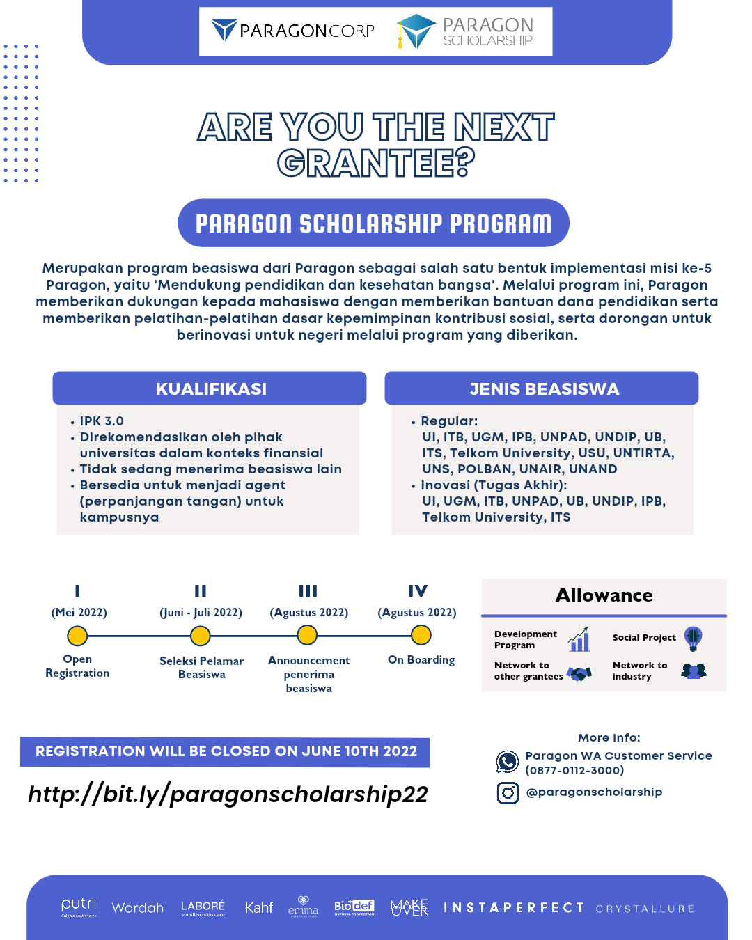 Paragon kembali memberikan kesempatan bagi kalian berkontribusi untuk bangsa melalui program beasiswa PSP (Paragon Scholarship Program). PSP merupakan program beasiswa dari Paragon sebagai salah satu bentuk implementasi misi ke-6 Paragon, yaitu 'Mendukung pendidikan dan kesehatan bangsa'. Melalui program ini, Paragon memberikan dukungan kepada mahasiswa dengan memberikan bantuan dana pendidikan serta memberikan pelatihan-pelatihan dasar kepemimpinan, kontribusi sosial, serta dorongan untuk berinovasi untuk negeri melalui program yang diberikan.