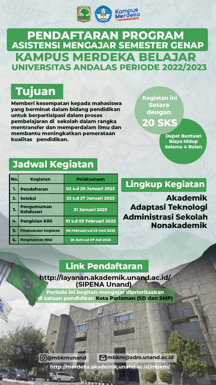 KAMPUS MERDEKA BELAJAR UNIVERSITAS ANDALAS PERIODE 2022/2023Pendaftaran Program Asistensi Mengajar Semester Genap