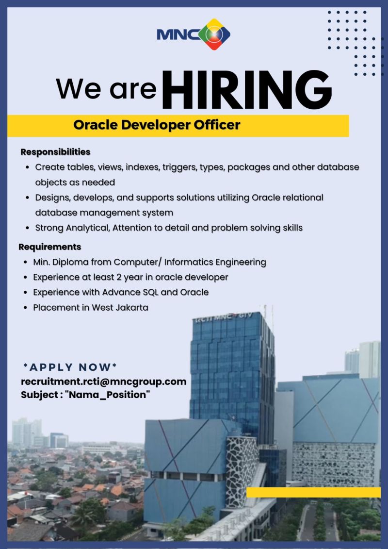 Saat ini perusahaan MNC Media 3TV (RCTI, MNCTV, GTV) sedang membuka lowongan pekerjaan untuk posisi : Oracle Developer OfficerPenempatan : Kebon Jeruk - Jakarta Barat