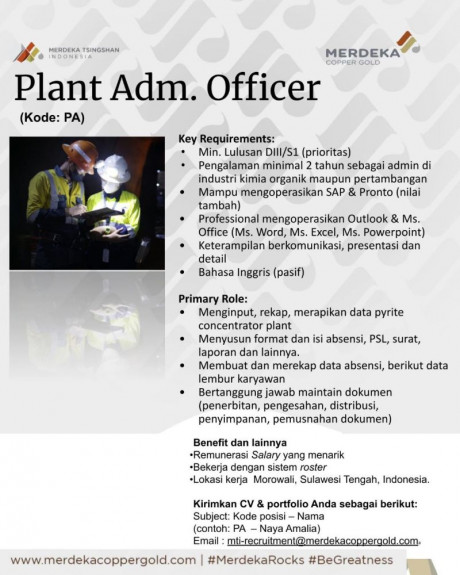 Saat ini PT Merdeka Tsingshan Indonesia sedang mencari kandidat yang cocok untuk penempatan di Morowali, Sulawesi Tengah sebagai Plant Adm. Officer.