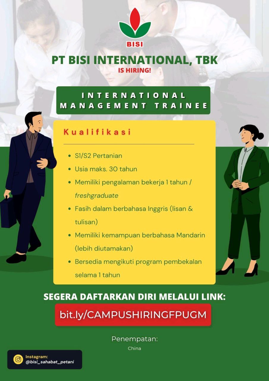 Saat ini, PT. BISI International, Tbk sedang mencari kandidat-kandidat terbaik untuk posisi International Management Trainee yang nantinya akan ditempatkan di China setelah mengikuti pembekalan selama 1 tahun.