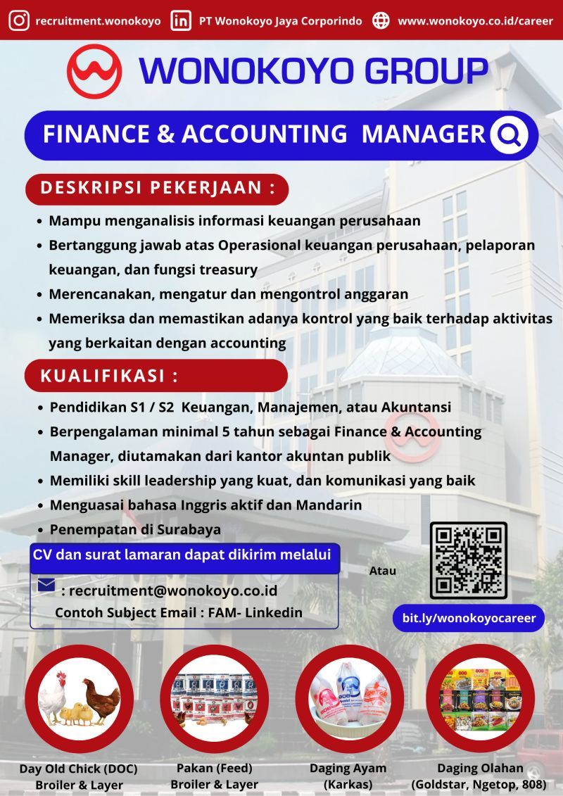 Wonokoyo Group sedang membuka lowongan kerja untuk posisi Finance Accounting Manager.Kualifikasi: