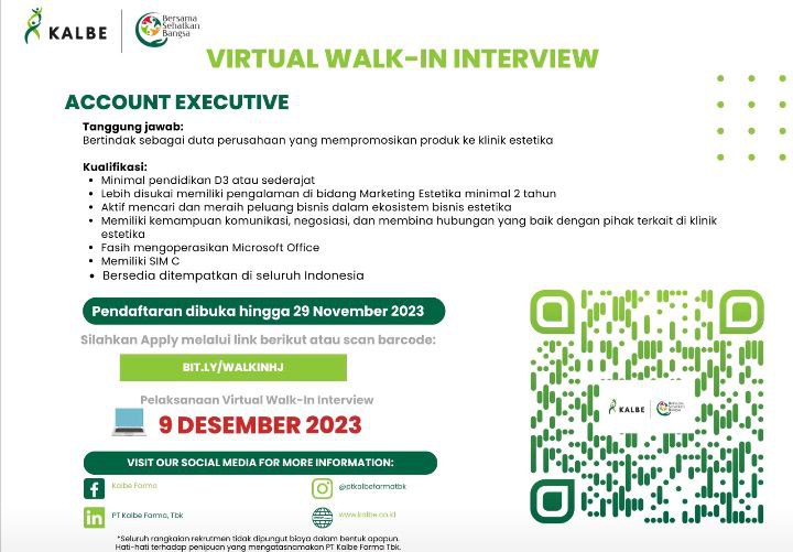 Melalui Virtual Walk-in Interview, PT Kalbe Farma Tbk kembali membuka kesempatan bagi Anda yang ingin berkarir di dunia Sales & Marketing dan siap ditempatkan di seluruh Indonesia!Open position: