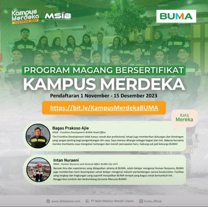 Segera daftarkan dirimu menjadi bagian dari Manusia BUMA dan tingkatkan kompetensi dalam lingkungan kerja yang sesungguhnya Link pendaftaran :