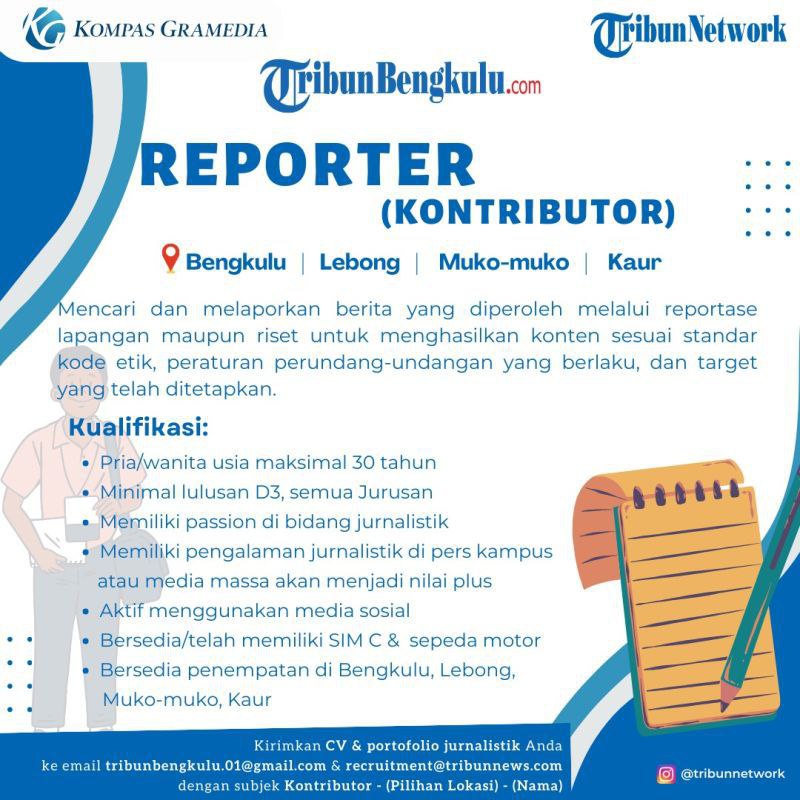 Silakan mengirimkan email ke recruitment@tribunnews.com dan tribunbengkulu.01@gmail.com, dengan subjek: Kontributor - (Pilihan Domisili Bekerja) - (Nama).