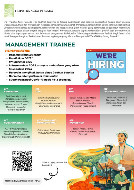 Saat ini, PT. Triputra Agro Persada membuka peluang bagi Lulusan Universitas Andalas melalui program Management Traine dengan posisi;