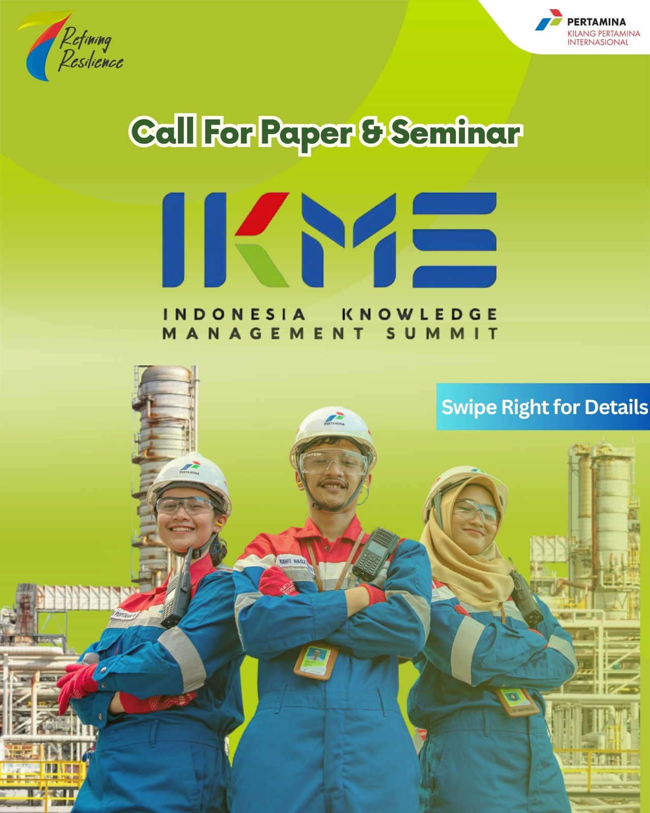 Dalam rangka menyambut HUT PT Kilang Pertamina Internasional yang ke-7 dengan tema “Refining Resilience”, PT KPI dengan bangga mengundang Anda untuk berpartisipasi dalam Indonesia Knowledge Management Summit (IKMS) Tahun Kedua