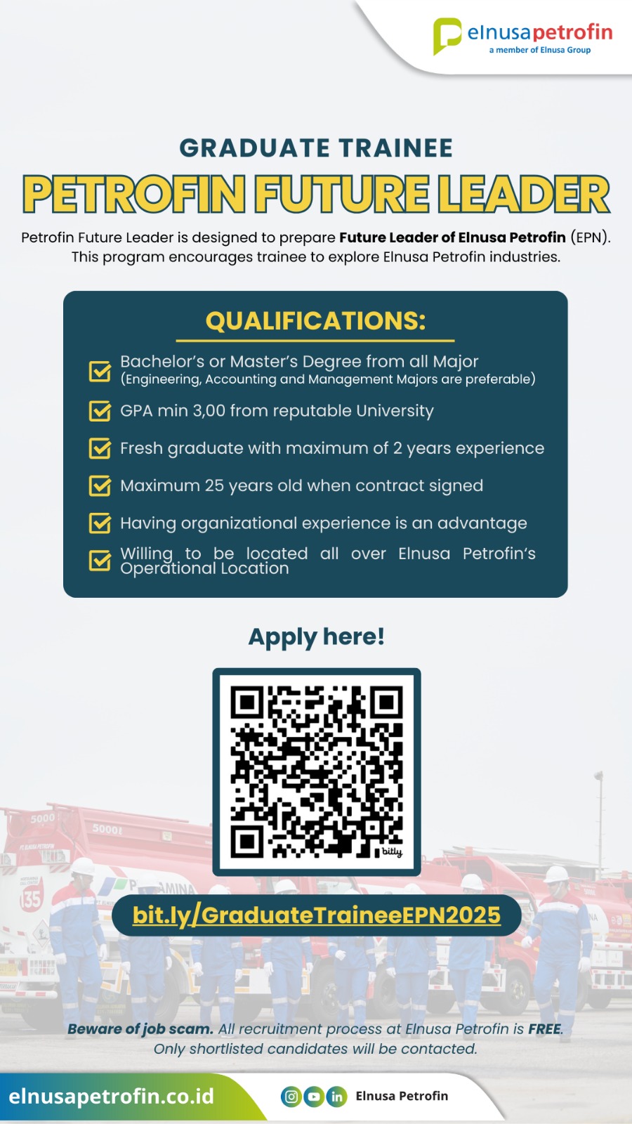 Beware of scams! Elnusa Petrofin’s recruitment process is FREE.
