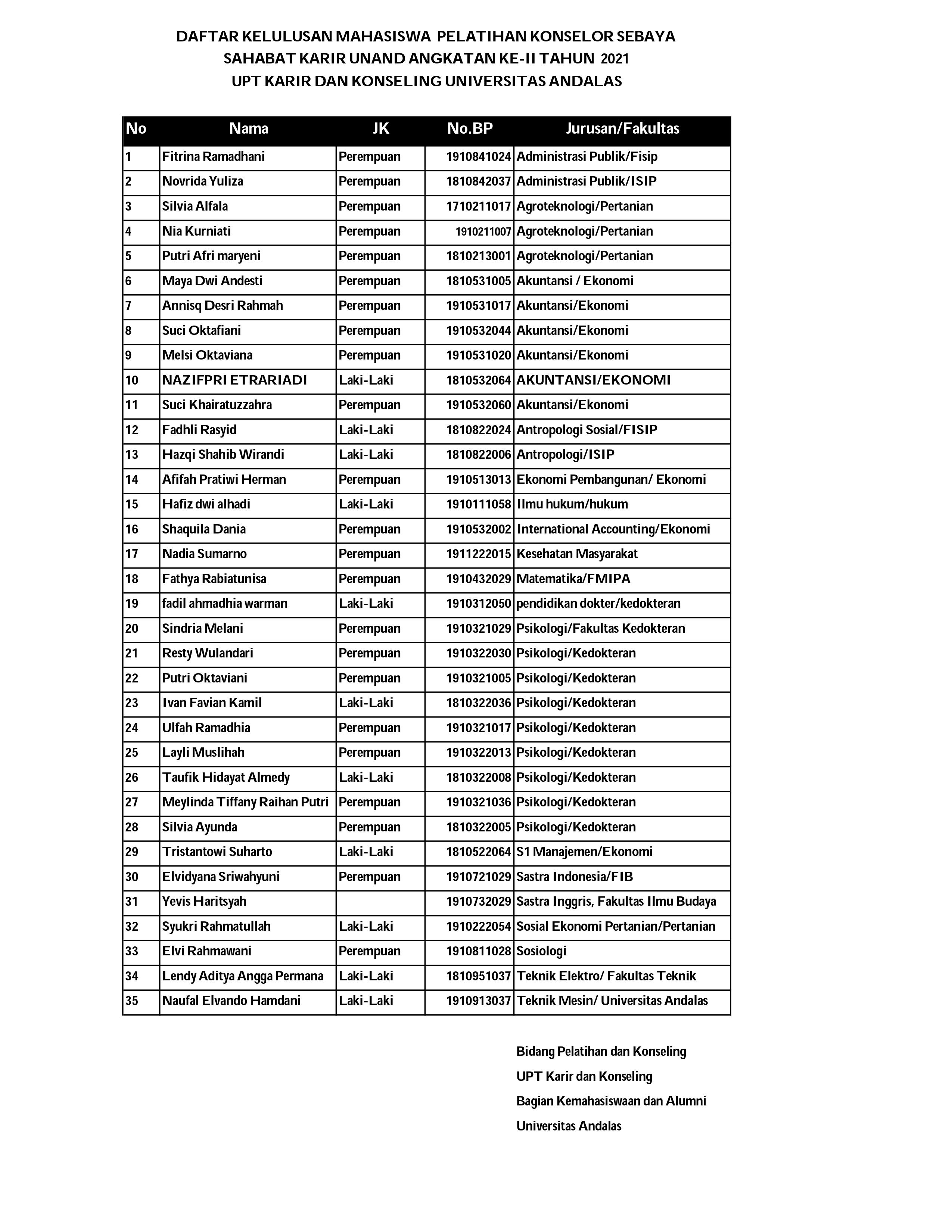 PENGUMUMAN KELULUSAN REKRUTMEN SAHABAT KARIR UNAND